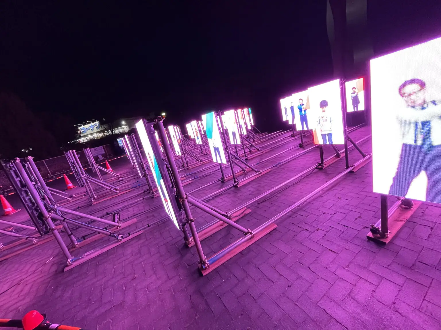令和5年3月25日〜26日に開催された「企業と芸術家の共創による文化創造」イベントでは、光のアーティスト髙橋匡太氏の作品「I am here」にLEDビジョンが使用されました。50面の屋外用LEDビジョン(ピッチサイズ3.91mm、W500mm×H1000mm)を組み合わせ、参加者50名が旗を振る映像を投影。まるでその場に人々が存在するような臨場感ある表現を実現しました。防水・防塵仕様で、昼夜を問わず高い視認性を保つ設計により、屋外イベントでも安定した映像演出を行うことができました。