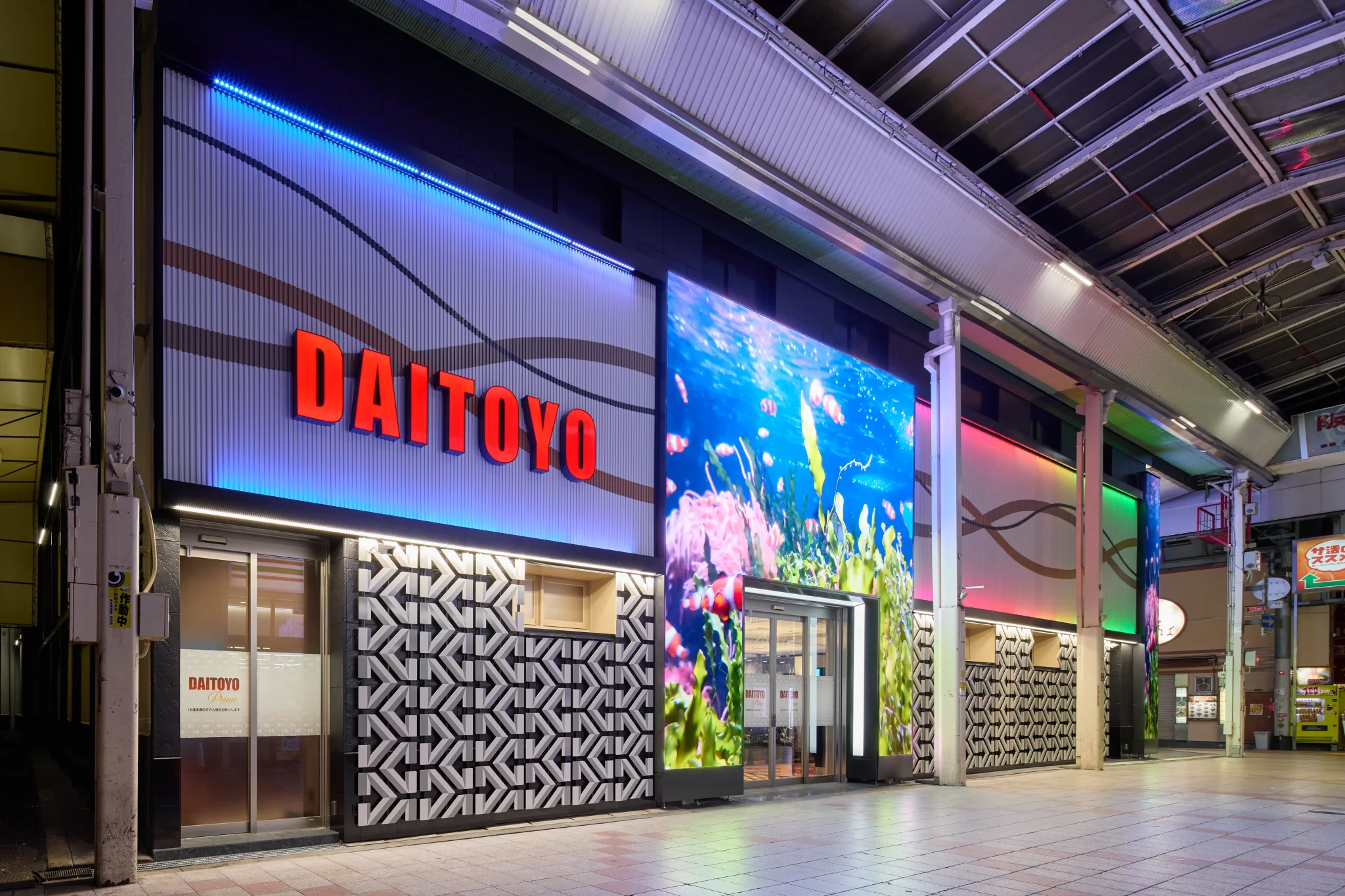 今回は、大阪・梅田エリアのエンターテインメント施設「DAITOYO Prime」で導入されたLEDビジョンの事例をご紹介します。屋外から屋内まで多様な映像演出を実現し、施設全体のブランディング強化に貢献しています。