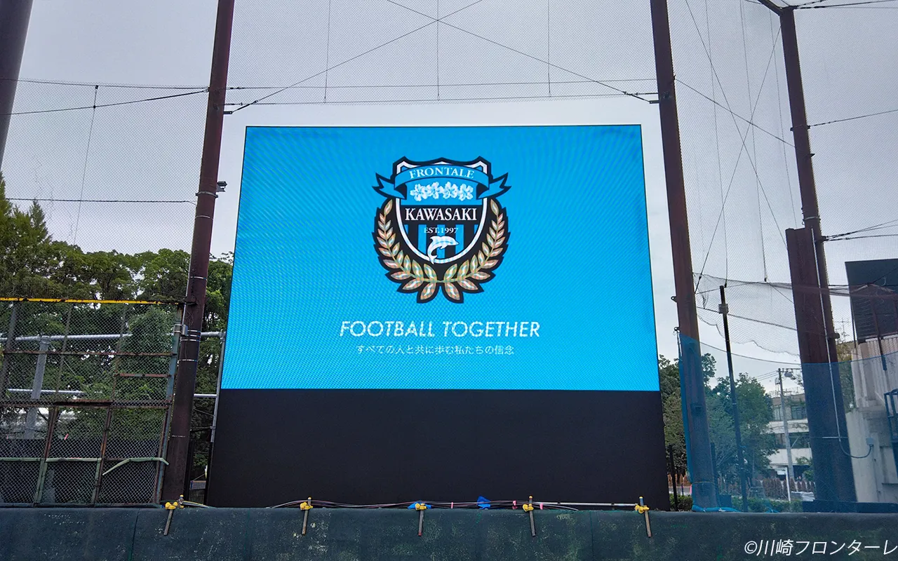 今回の導入では、防水防塵仕様の屋外用LEDビジョン(ピッチサイズ10.4mm、W9,000mm×H6,000mm)を設置しました。広いスタンド全体からでも映像が鮮明に見える高輝度ディスプレイで、得点ボード・カメラ映像・広告映像を柔軟に切り替え表示できる構造が特徴です。これにより、試合進行中もリアルタイムの臨場感を維持しつつ、イベント時にはプロモーション映像や地域CMの放映も可能となりました。スポーツの熱気をより身近に伝えるこのLEDビジョンが、富士通スタジアム川崎の新しい象徴となっています。