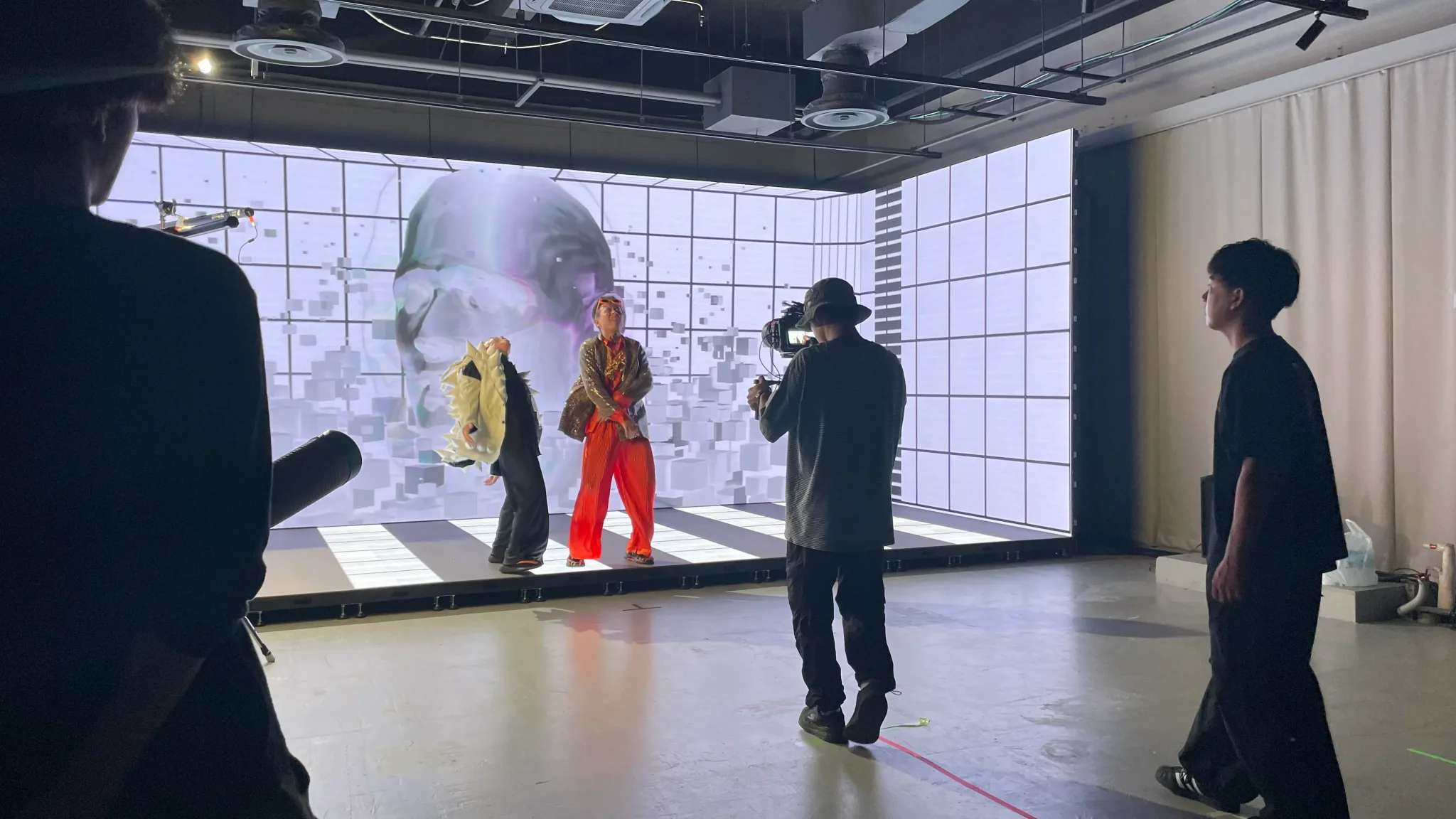本事例では、スタジオ空間に正面・左右・床面の4面LEDビジョンを配置することで、被写体を映像で包み込む環境を構築しました。複数のLED面が連動して動くため、映像とアーティストの動きが一体化し、従来の背景素材では再現できない没入感の高い映像空間を演出できます。また、色彩や光の変化を瞬時に切り替えられるため、楽曲のテンポやシーン転換に合わせた表現が可能です。MV制作において、大規模なセットを用意せずとも、多彩な世界観を再現できる点が大きな利点です。