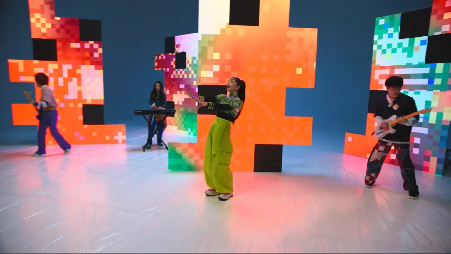 楽曲のテーマは”無敵/ゾーン状態”。LEDビジョンは高輝度・高精細な表現力があり、スタジオ撮影でありながらライブのような臨場感を実現可能です。娯楽・興業分野においても、LEDを活用した映像表現の幅がさらに広がることを示す事例となりました。