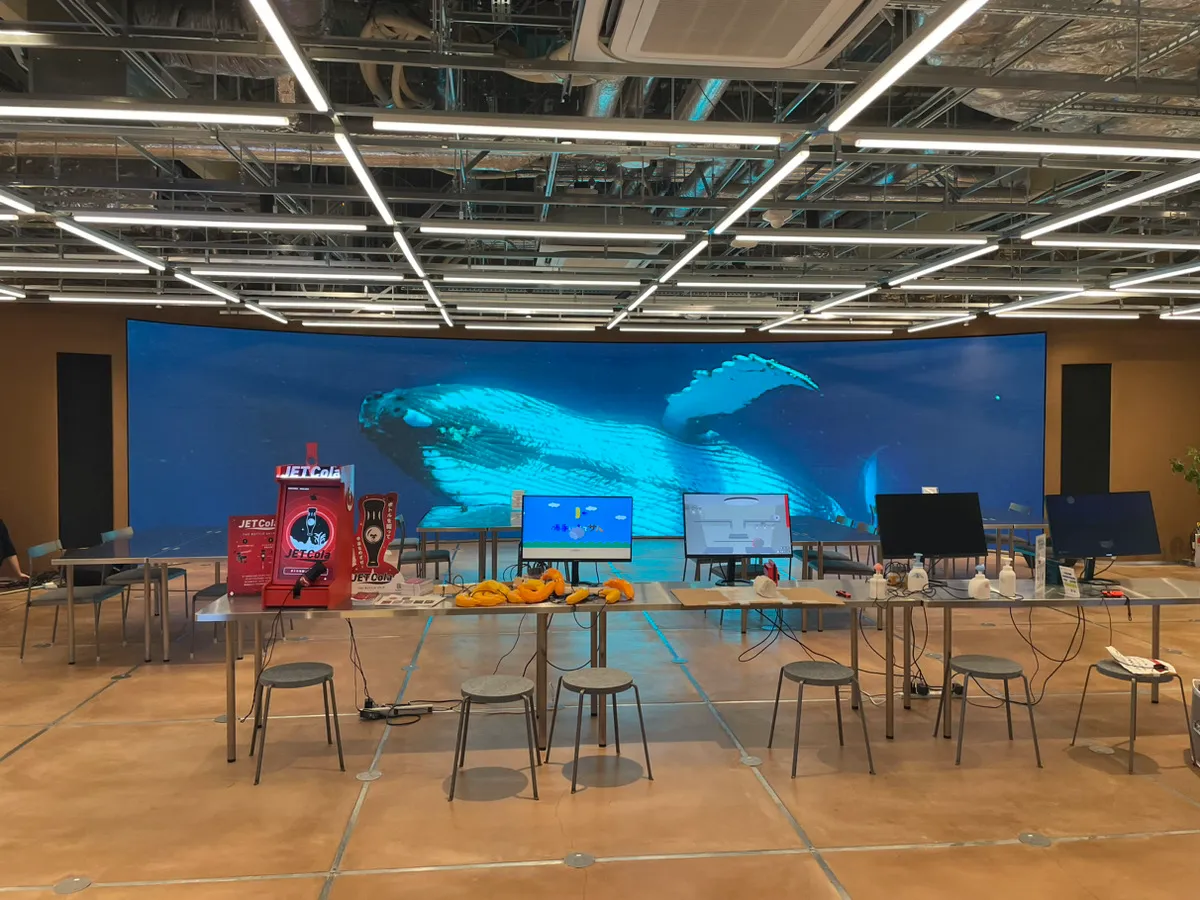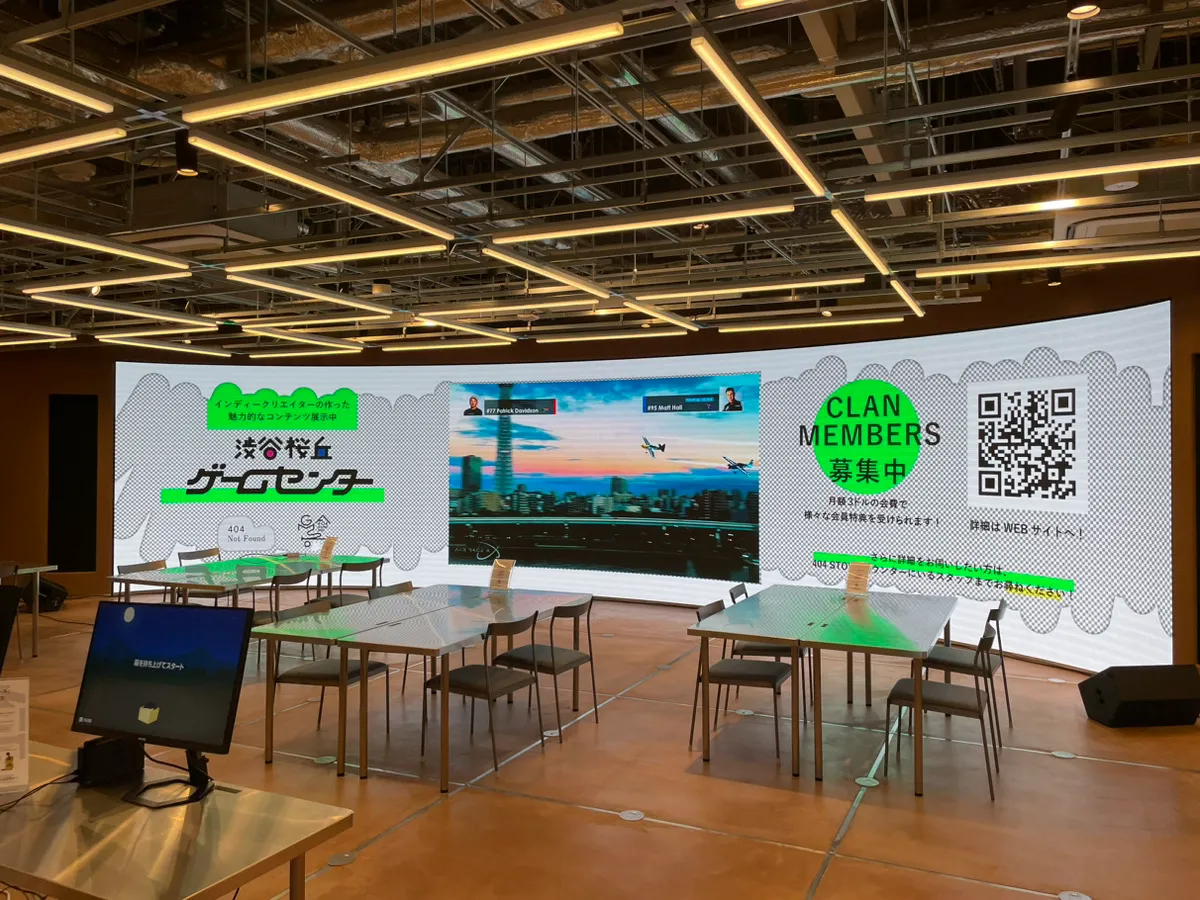 イベントスペースには、幅10m超の大型LEDビジョンが設置され、ゲーム展示やトークセッション、音楽イベントなど、用途に応じて柔軟にコンテンツを切り替えることができます。LEDビジョンの高輝度と広視野角により、会場全体に統一感と臨場感を演出。来場者はどの位置からでも映像を楽しめ、空間そのものが一体化した体験を提供します。また、フレキシブル型構造により湾曲面にも対応しており、空間デザインに合わせた自由なレイアウトが可能です。
