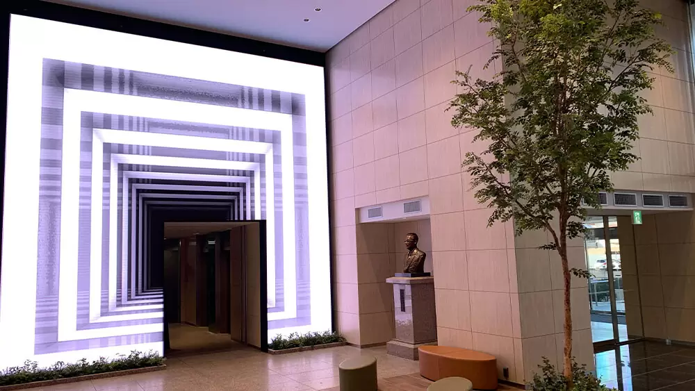 エントランスの改修に合わせて設置されたLEDビジョンは、W6,000mm×H6,000mmの迫力あるサイズで、高精細ピッチ3.125mmを採用。エレベーターホール前に門型で構築し、視界全面に広がる没入感の高い映像表現を実現しました。自然風景や地域文化コンテンツ、企業ブランディング映像など多彩なコンテンツを再生可能で、来訪者の視線を自然に誘導し、空間全体の印象を強化。さらに、映像切替によりイベントや季節に応じた演出が可能となり、日常的な動線に新しい体験価値を創出しました。従来の静的サインでは難しい柔軟な情報演出を叶え、企業の革新性を象徴するエントランスへと進化しています。