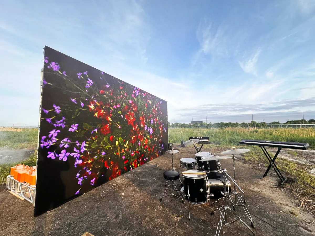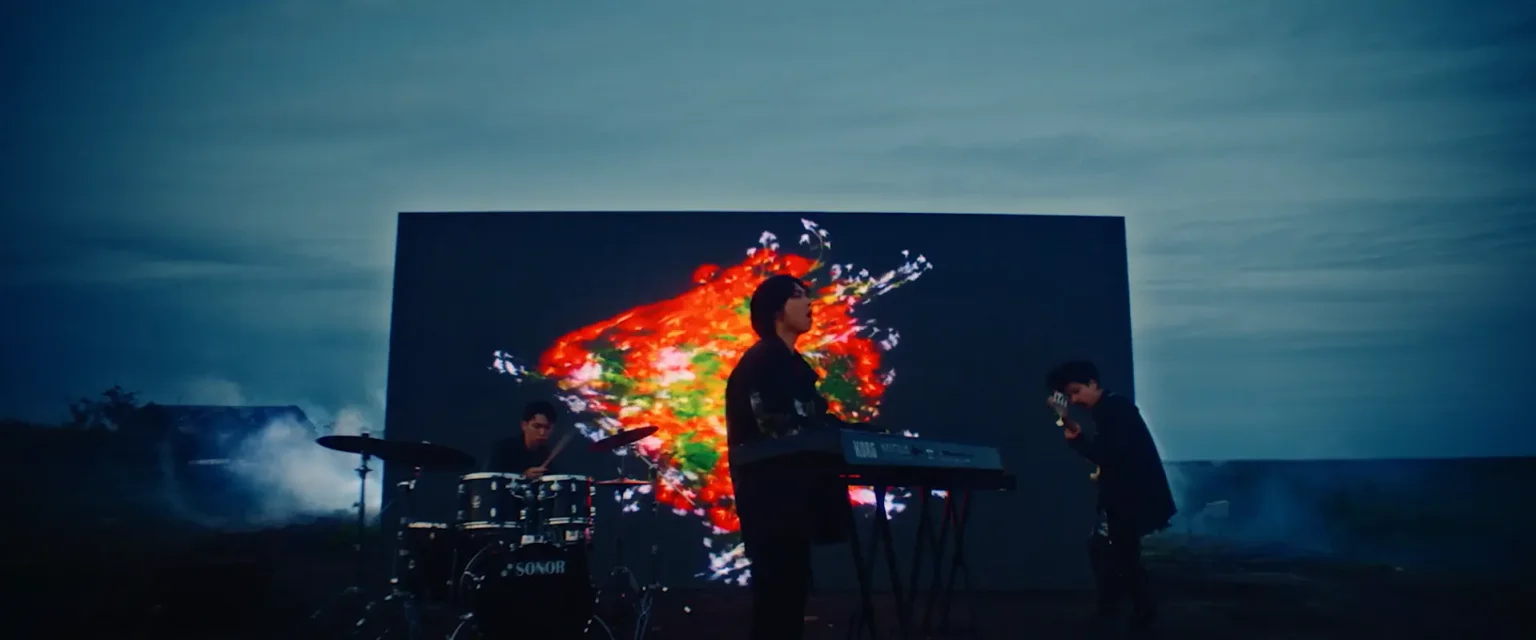 Omoinotakeの「蕾」MVは、TVアニメ『僕のヒーローアカデミア』第7期エンディングテーマの為に描き下ろされた楽曲で、「荒廃と彩り」「人工と自然」「救いと恐怖」など『異なるものの共演』をコンセプトにつくられました。MV撮影では、屋外撮影にも対応する高輝度のLEDビジョンを使用し、太陽光下でも映像の色彩が失われない高い視認性を確保しています。特に黒の締まりを生む高コントラスト性能は、楽曲が持つ緊張感やスピード感の表現に大きく寄与しました。